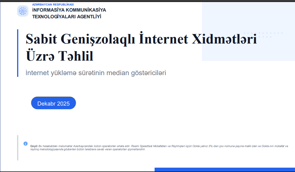 "Ookla" — İnternet sürətinin və şəbəkə keyfiyyətinin ölçülməsi üzrə qlobal lider olaraq Speedtest®, Downdetector®, Ekahau® və RootMetrics® brendlərinin ekspertizasını birləşdirərək misilsiz şəbəkə və bağlantı analitikası təqdim edir. Çoxmənbəli məlumatları sənaye üzrə aparıcı biliklərlə birləşdirərək, şəbəkə performansı göstəricilərini strateji və tətbiq oluna bilən analitik nəticələrə çevirir.